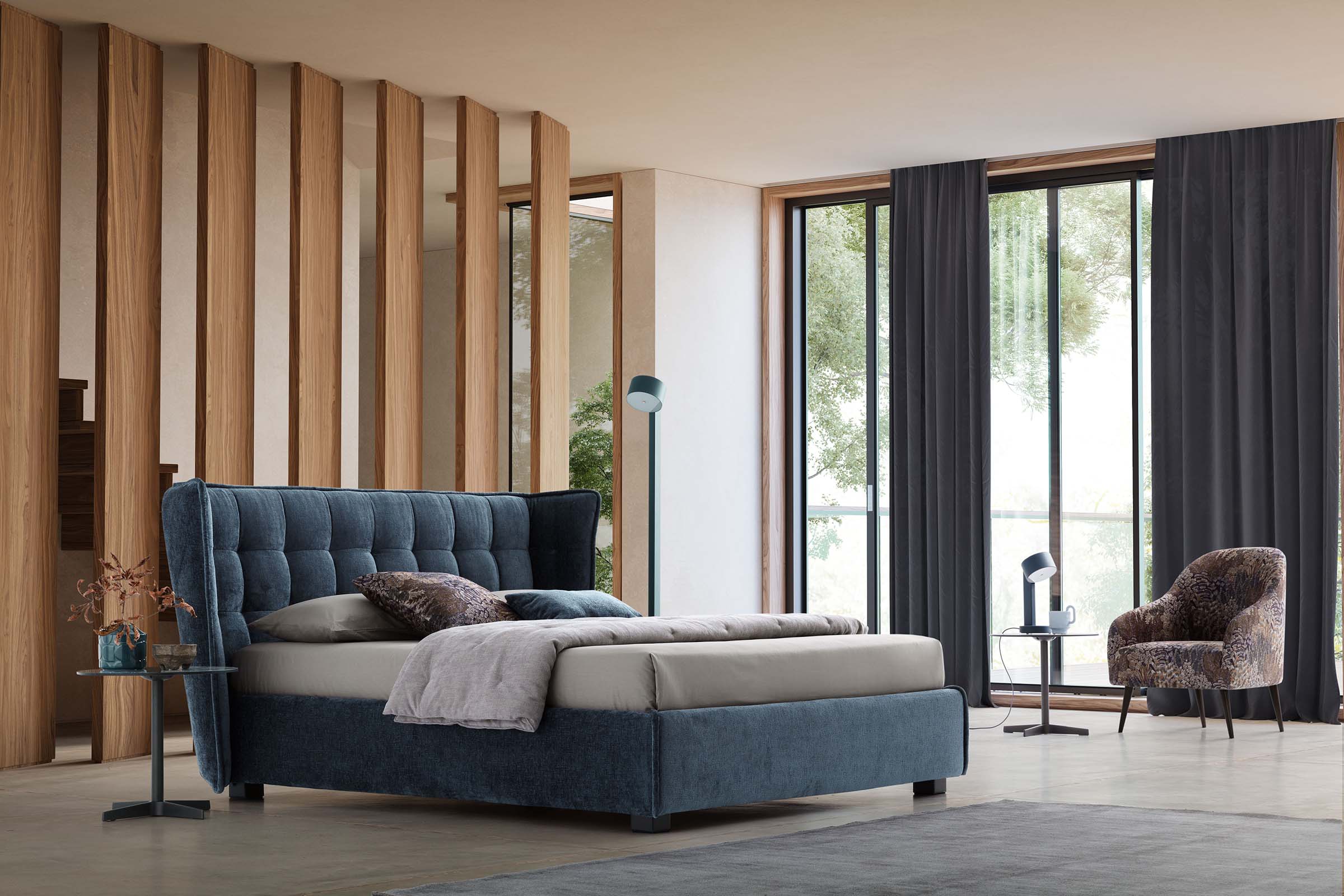 A bed can break the linearity of tradition to follow the most unexplored trajectories of design: Major abandons the straight path and chooses the irreverent lateral curvature of the headboard, elegantly marked by the cadenced quilting and the significant thickness of the raised edge.